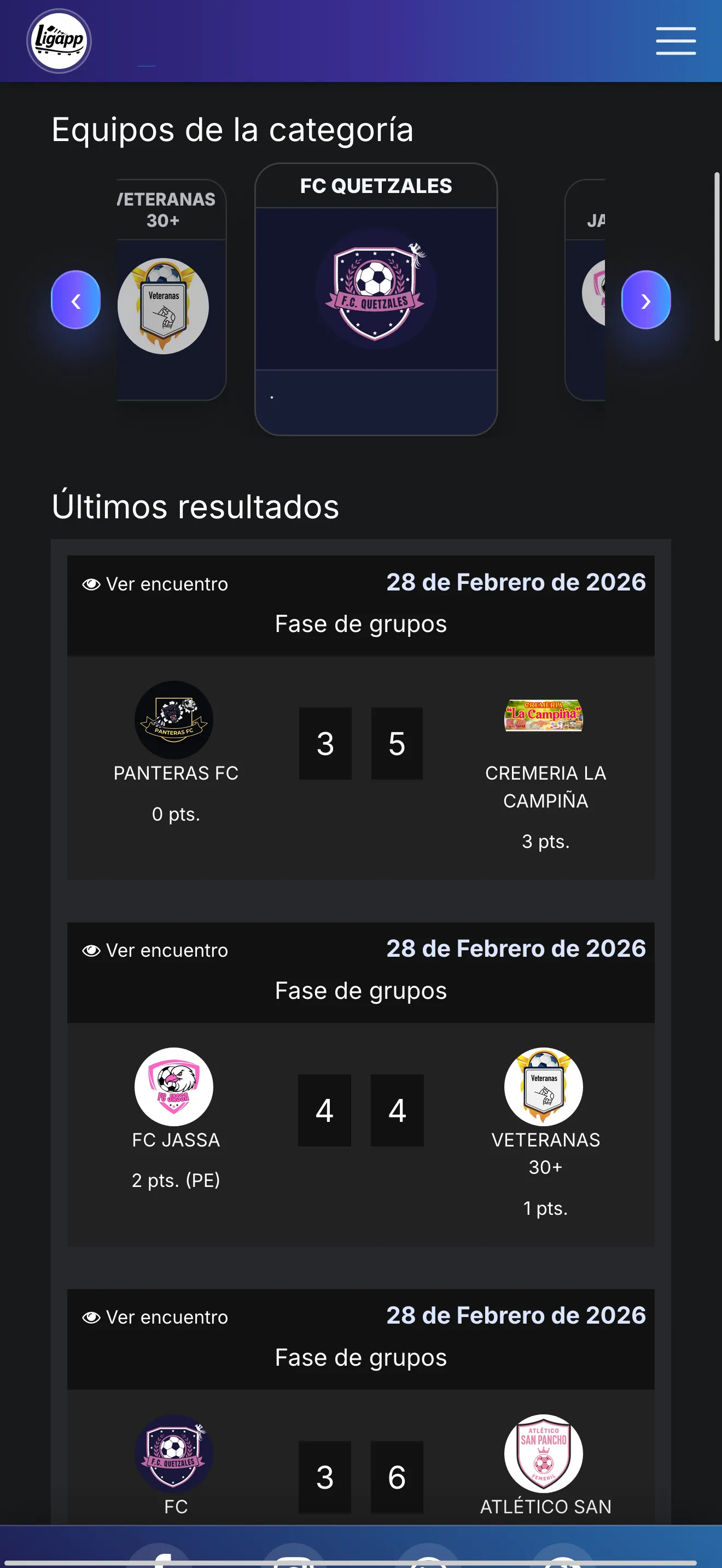 Consulta resultados, estadísticas, equipos y accesos desde una sola vista en la app.